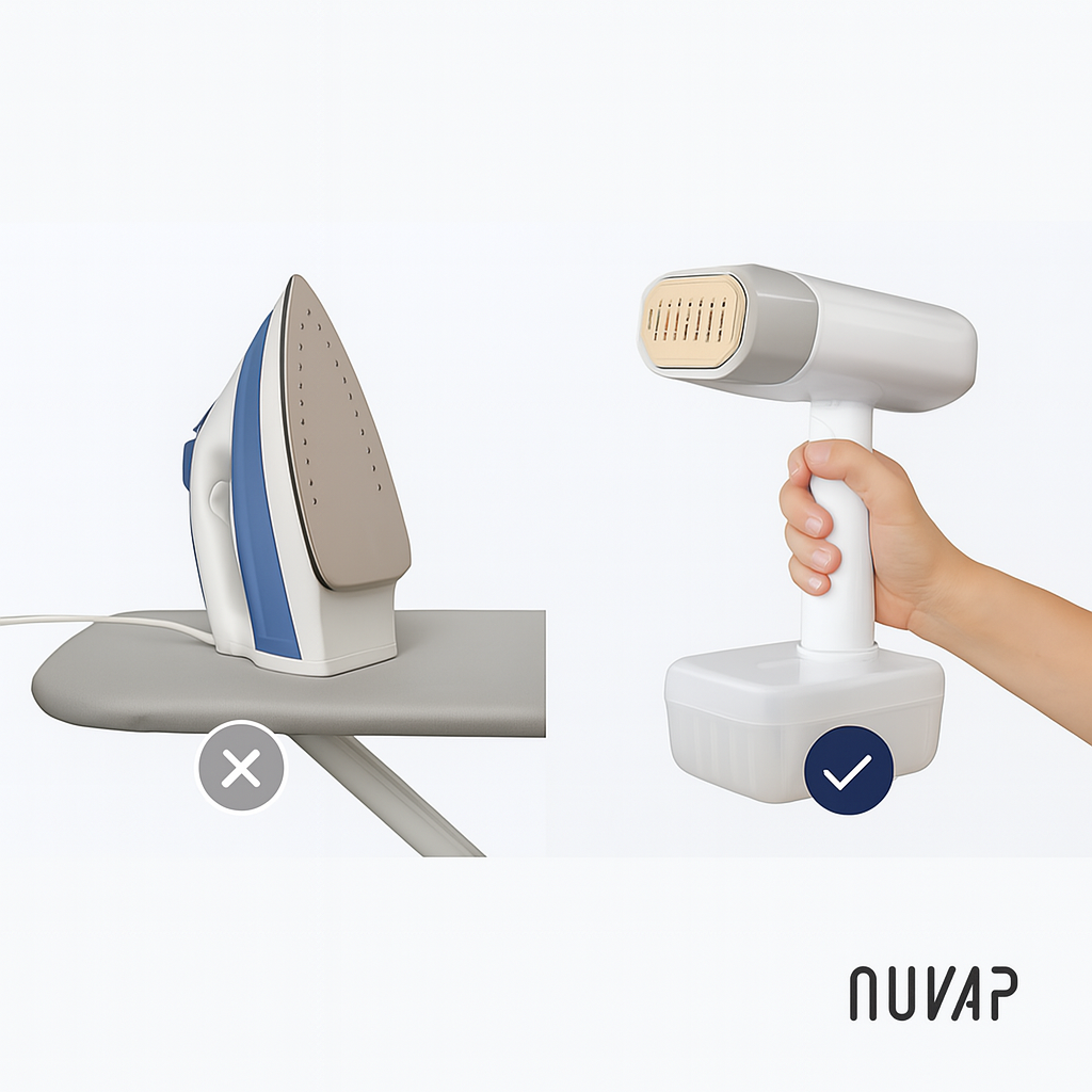 Les fers traditionnels prennent de la place, mettent du temps à chauffer, et peuvent abîmer vos vêtements. Nuvap® simplifie votre routine textile : plus rapide, plus sûr et prêt à l’emploi, même en déplacement.